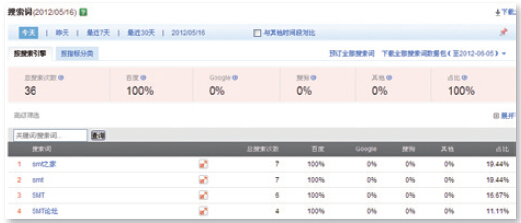 僅僅分析到搜索引擎是不夠的,需要細化到搜索引擎下面的搜索詞帶來(lái)流量的表現。在【搜索詞】報告中給出了在百度、谷歌、搜搜等,及其他搜索引擎之和四部分的比例數據,首先詳細了解搜索詞在各引擎中的比重;同時(shí)注意占比給出了各個(gè)搜索詞占所有搜索詞的訪(fǎng)次比重(理解為通過(guò)搜索引擎帶來(lái)了多少訪(fǎng)客的比率),可以了解該搜索詞對網(wǎng)站流量的影響比重,由于做SEO的精力和資源都是有限的,所以后續操作要更有重點(diǎn)。另外根據需要還可以點(diǎn)擊列頭總搜索次數、百度、谷歌、搜索下方帶有下劃線(xiàn)的數字,進(jìn)入查看搜索詞的其他數據表現。