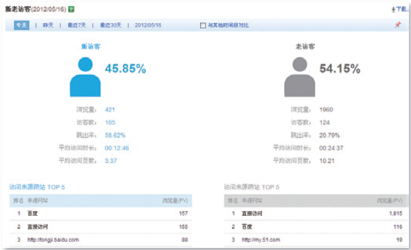 另外,在百度統計中有【新老訪(fǎng)客】報告,其中細分了二者來(lái)源、訪(fǎng)問(wèn)頁(yè)面等指標,讓站長(cháng)區分新老訪(fǎng)客的不同行為。